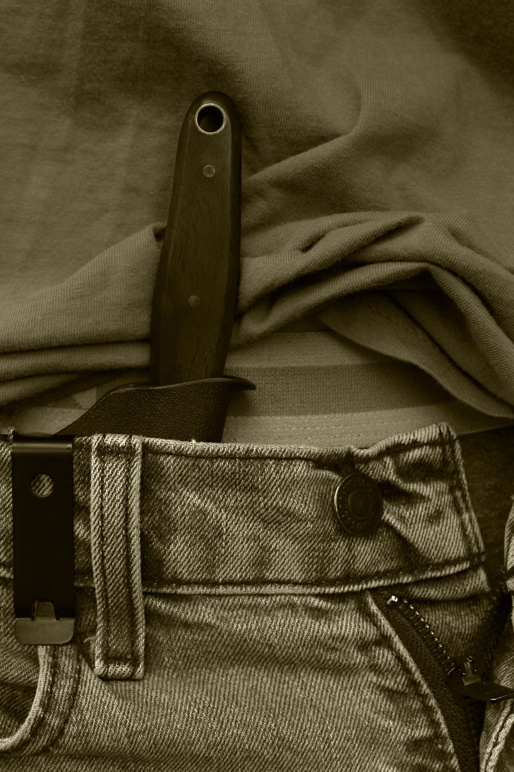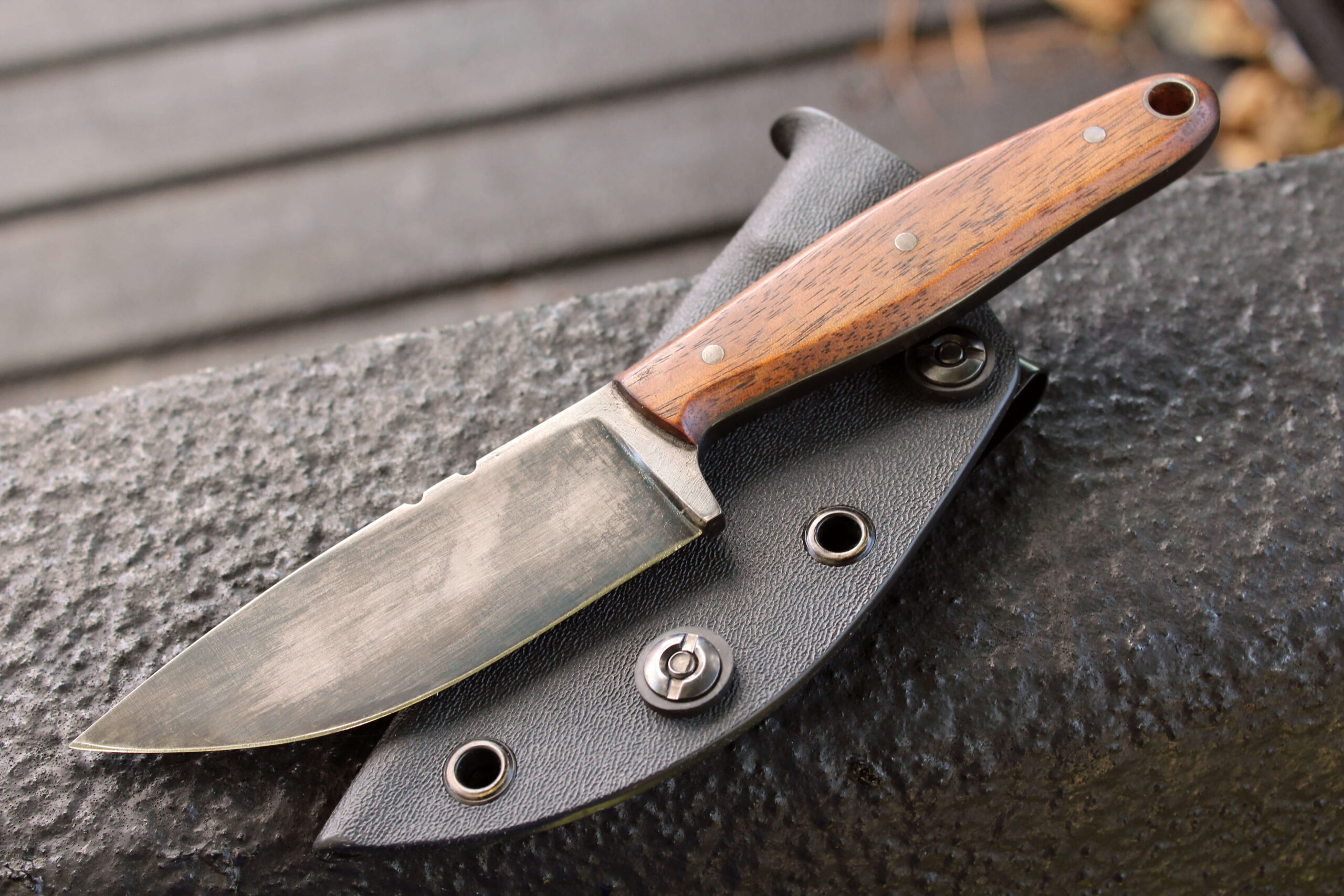 EDC (every day carry) blade cut from 1095 high carbon steel, heat treated to hardness and tempered to strength with cold blue accelerated patina. Resin impregnated wood for knife scales with scrap nails for pins and auto-vehicle brakeline for lanyard tubing. Heat-molded Kydex waistline clip-on sheath.